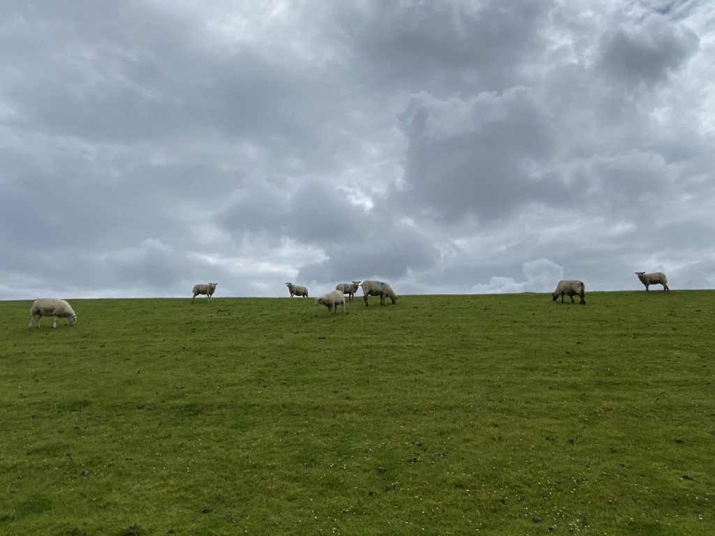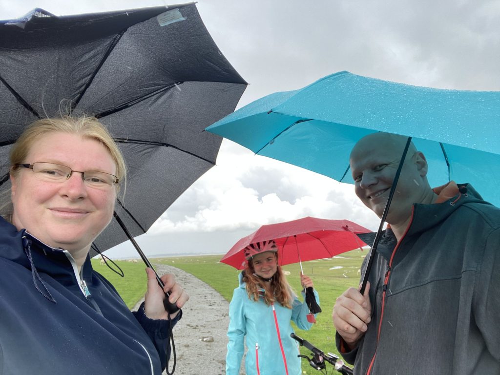 Unsere heutige Radtour hat uns auf die Halbinsel Nordstrand geführt. Gestartet sind wir gegen Mittag, da ließ der Regen nach. Doch es dauerte nicht lang und wir mussten unsere Schirme raus holen und das mitten auf dem Deich zwischen den Schafen.