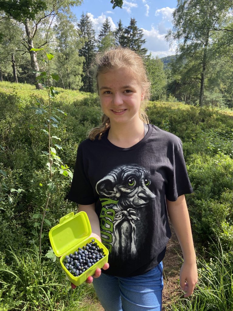 Der Rückweg führte an eine große Heidelbeerwiese vorbei. Sara hat wieder eine Schale voll gepflückt. Vorher haben meine zwei uns einen Sitzplatz besorgt.