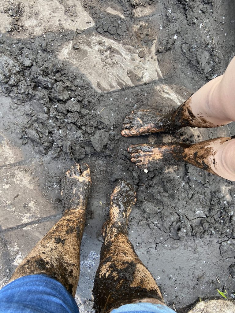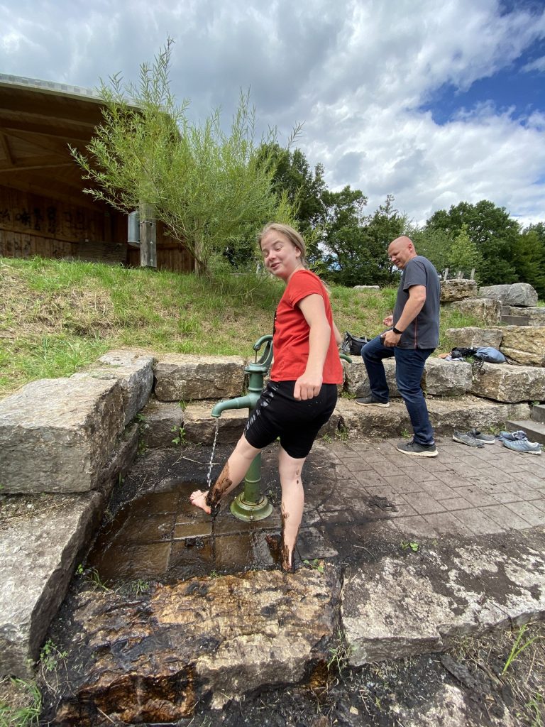 Kurz danach erreichten wir unser Ziel: ein kleines Moor-Becken. Sara und ich probierten es aus. Wir sind ganz schön versunken. Gott seih Dank gab es eine Wasserpumpe zum Waschen.