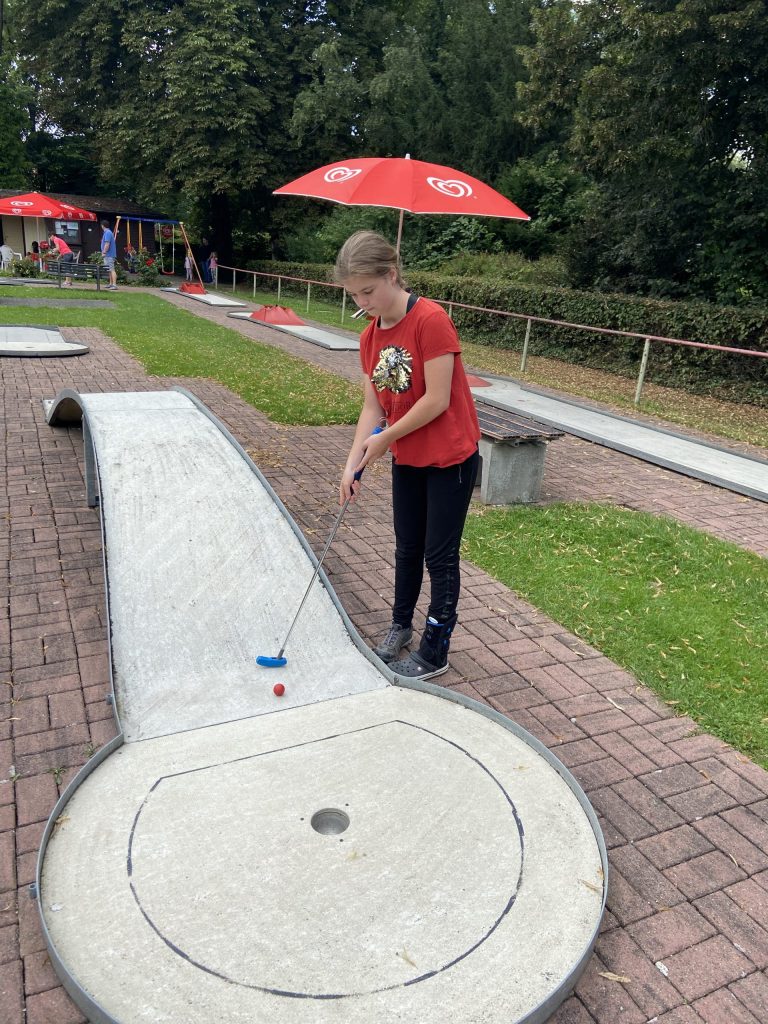 Beim Minigolf probierten wir Denny zu schlagen. Es ist uns nicht geglückt. Er hat wieder gewonnen.