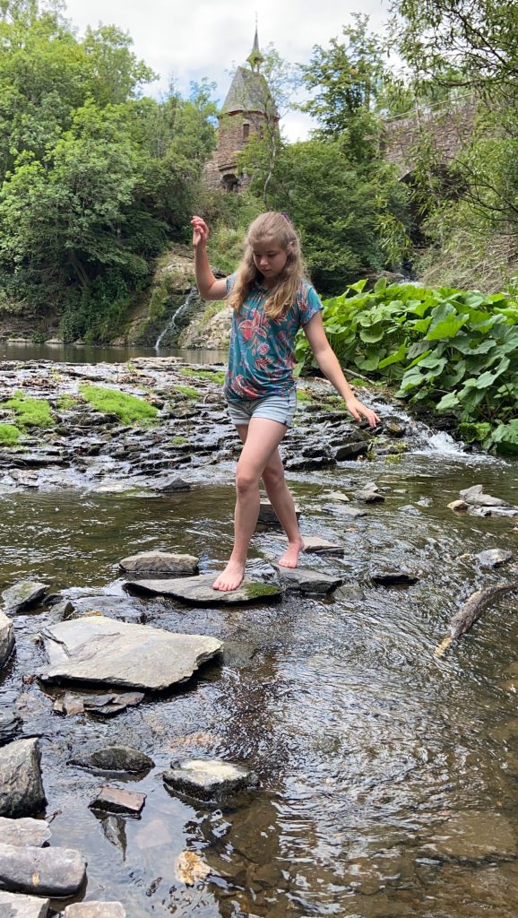 Das erste Highlight hatten wir nach 2,5 km. Ein kleiner Wasserfall an der Pyrmont Mühle. Zum Wasserfall konnte Sara diesmal nicht, aber mit den Füßen ins Wasser.