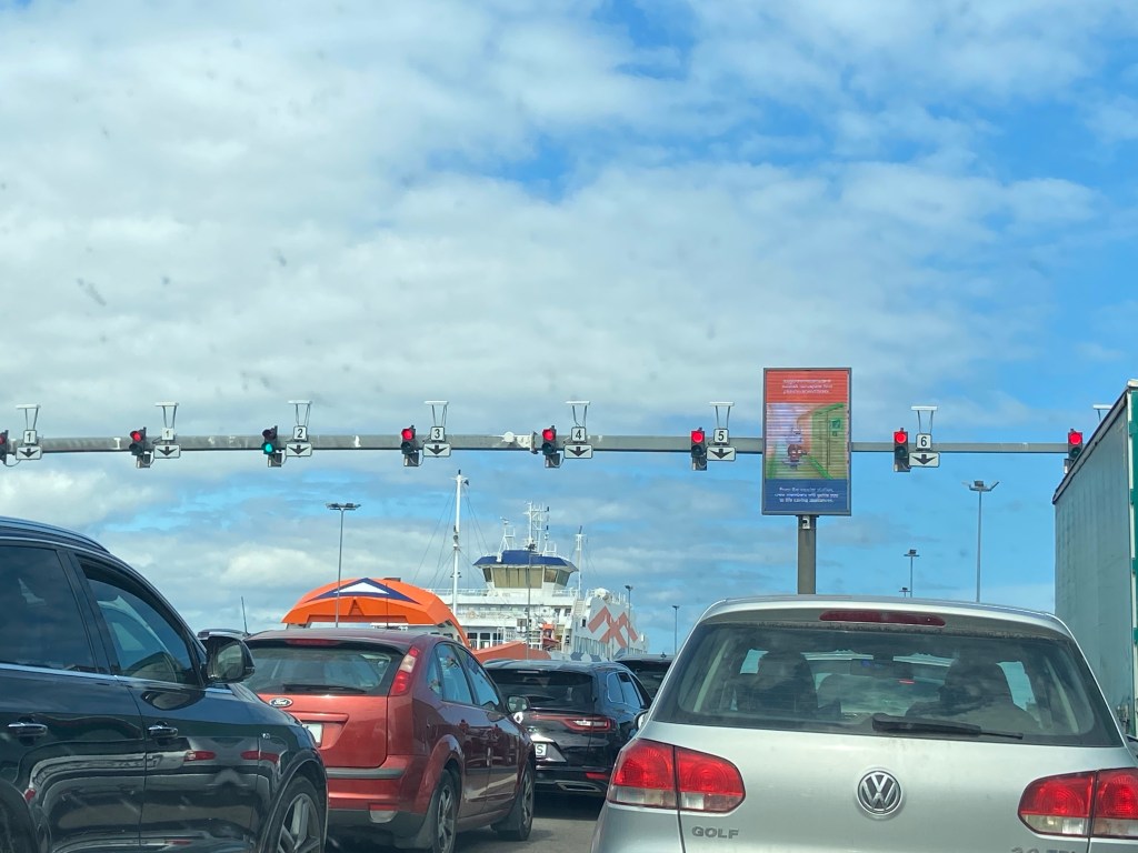 In der Zwischenzeit kam eine zweite Fähre. Wieder durfte Bahn 7 beginnen, dann Bahn 2 +3, es folgte Bahn 8 und dann die Bahnen 4 + 5. Es war jedes Mal wie ein Krimi, welche Lampe grün aufleuchtet. Die Fähre war schon mega voll. Dann endlich durften ein paar Autos von Bahn 6 noch mit drauf, auch wir. Yippie.