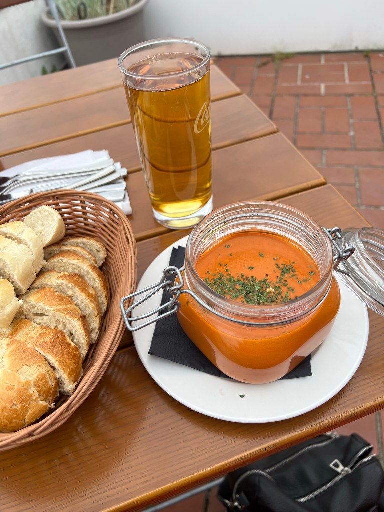 Zum Aufwärmen gab es eine Tomatensuppe mit Krabben.