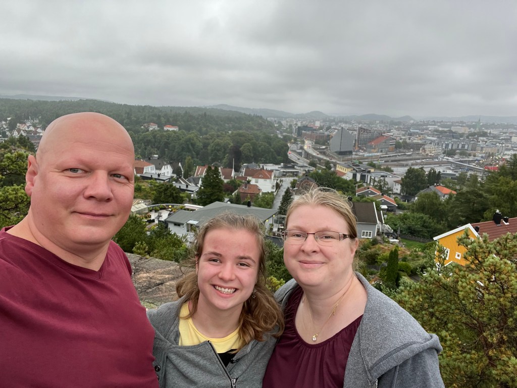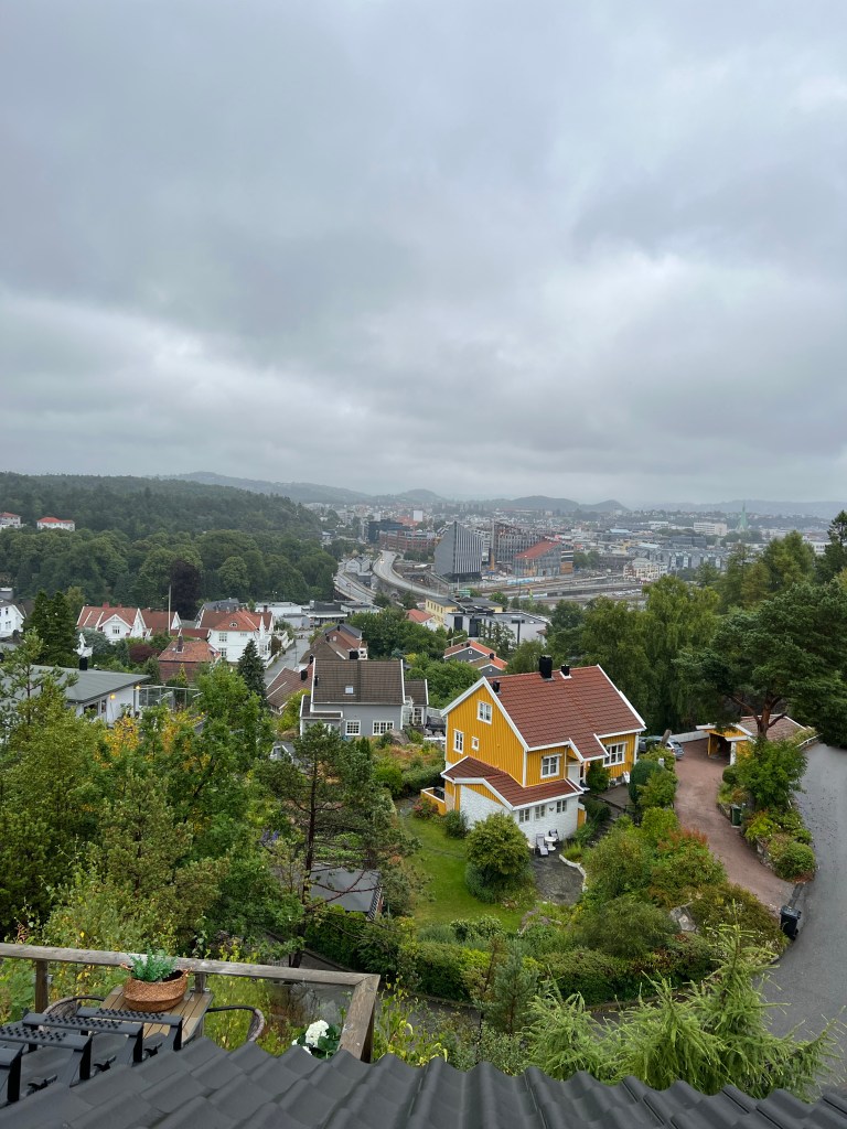 Die erste Nacht in Norwegen verbringen wir hier. Die Unterkunft ist nur eine paar Minuten vom Hafen entfernt und liegt auf einem kleinen Berg. Wir haben einen tollen Blick auf die Stadt.