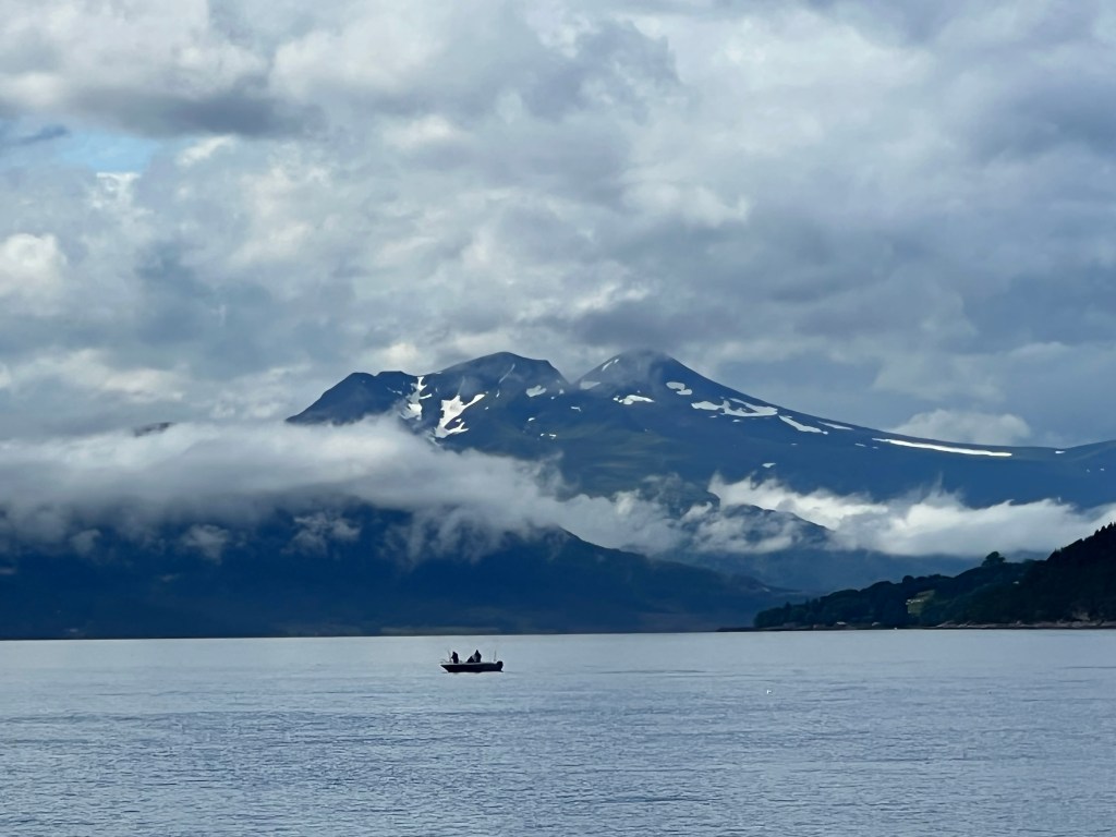 Dann ging es weiter. In Solnes sind wir mit der Fähre über den Fjord. Und siehe da, die Sonne kam raus. Die Überfahrt dauerte nur ein paar Minuten, war von der Landschaft aber sehr schön.