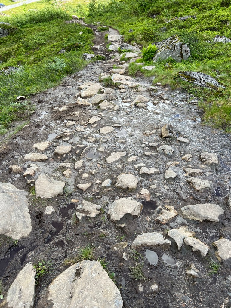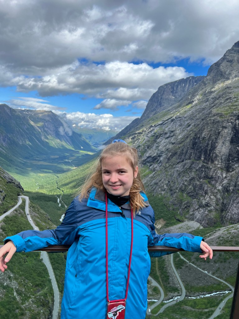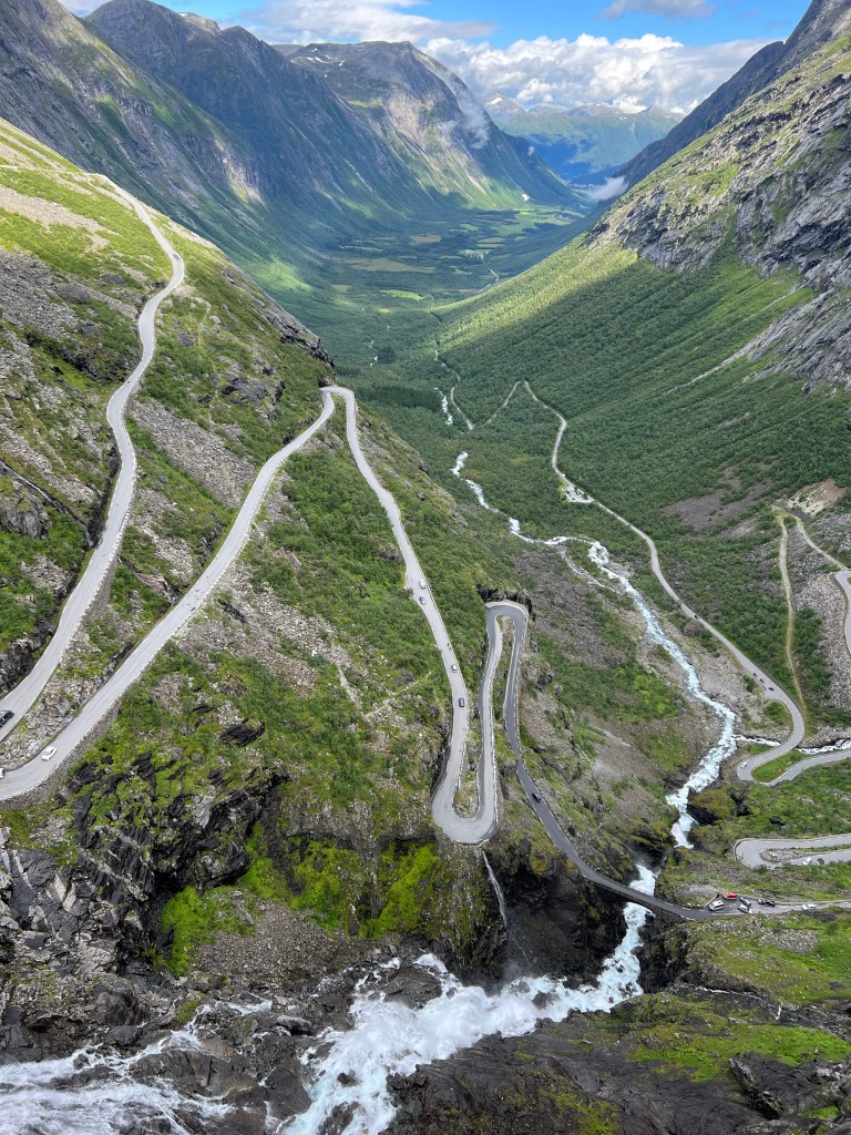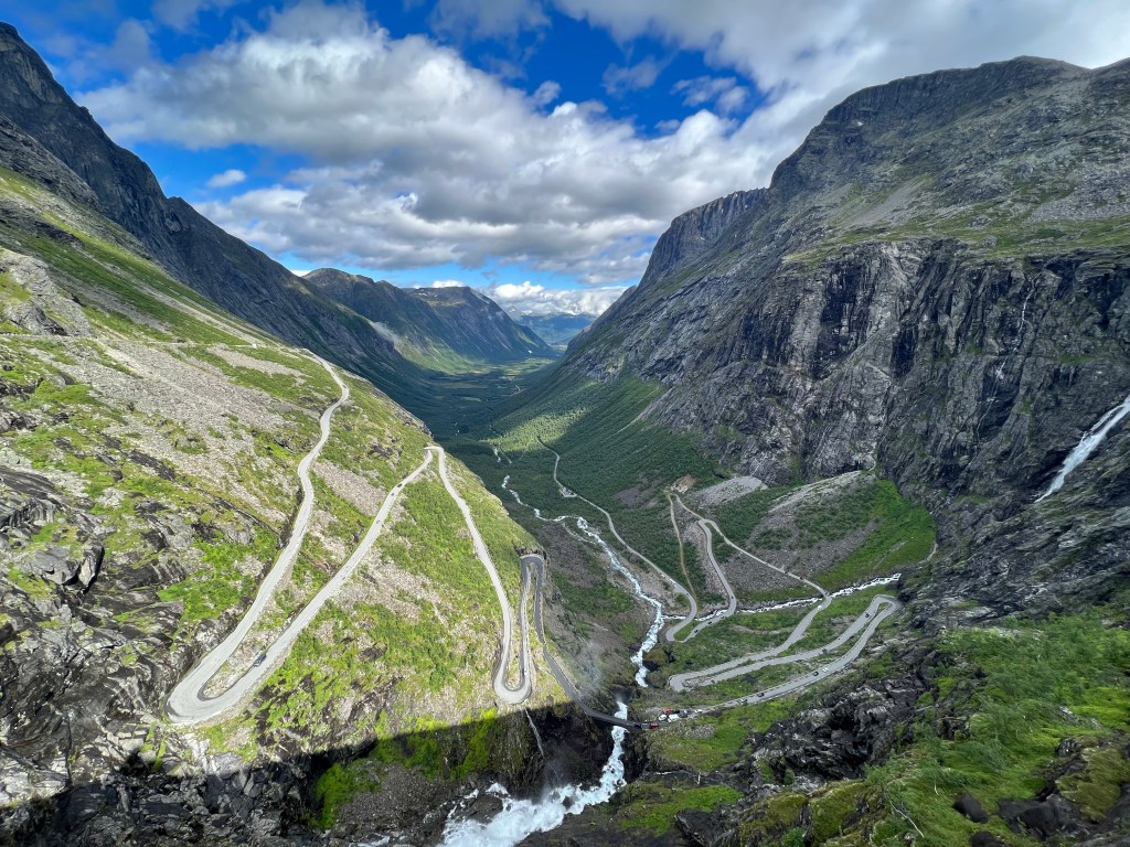 Heute ( Freitag 05.08.) hat dann die Sonne geschienen. Das heißt aber nicht unbedingt, dass T-Shirt Wetter war. Nach dem Frühstück ging es zu den Trollstigen. Die Trollstigen ist eine Straße durch den Bergen. Wir sind von Andalsnes gestartet. Die Strecke ist teilweise sehr eng. Erstaunlich wie da zwei Fahrzeuge aneinander vorbei kommen, geschweige dann Bus oder Wohnwagen. Denny hat das super gemacht und uns heile rauf und runter gebracht. Oben gibt es dann eine tolle Sicht auf die Trollstigen.