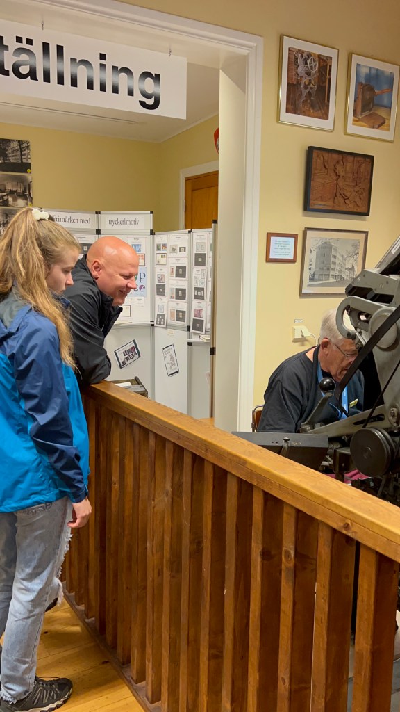 Ich hab es euch probiert zu fotografieren. Per Tasten, wie auf einer Schreibmaschine, wurden die Buchstaben ausgewählt und dann aneinander gereiht und auf ein Metallstück gepresst. In Spiegelschrift ist von rechts nach links geschrieben: Grafiska Museet i Gamla Linköping.