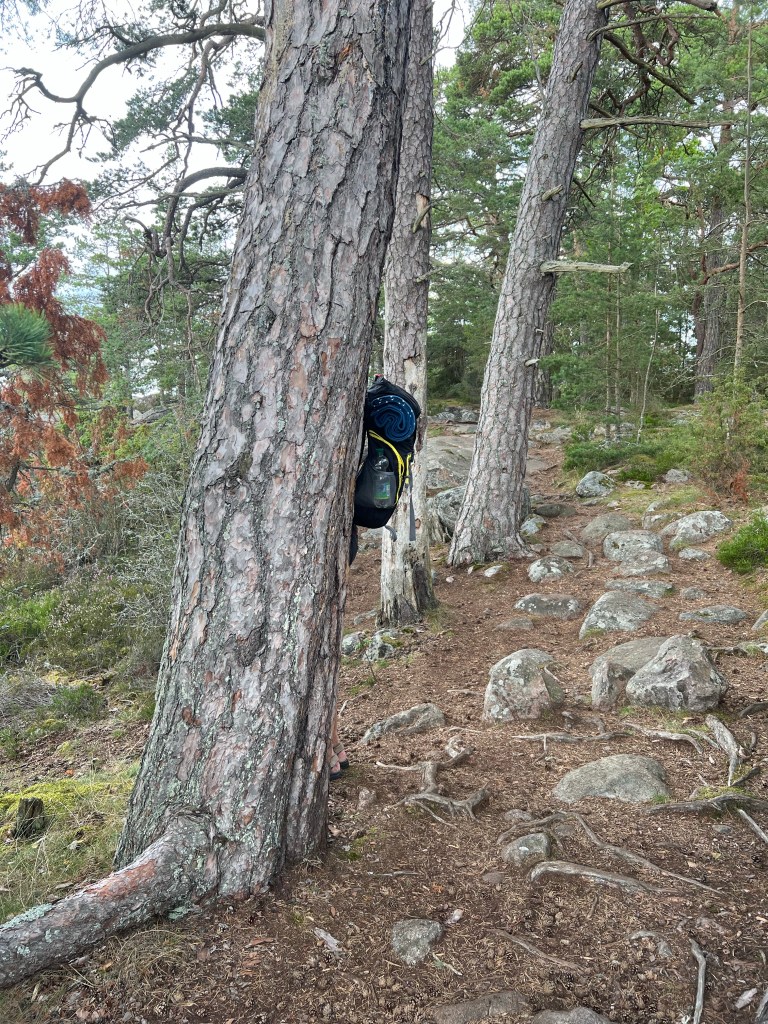 1. Die Landschaft ist sehr schön. Ich wäre auch gern da mitgelaufen . Denny seine Hacken und Sandaletten sind hinter diesen Baum zu sehen. + Rucksack.