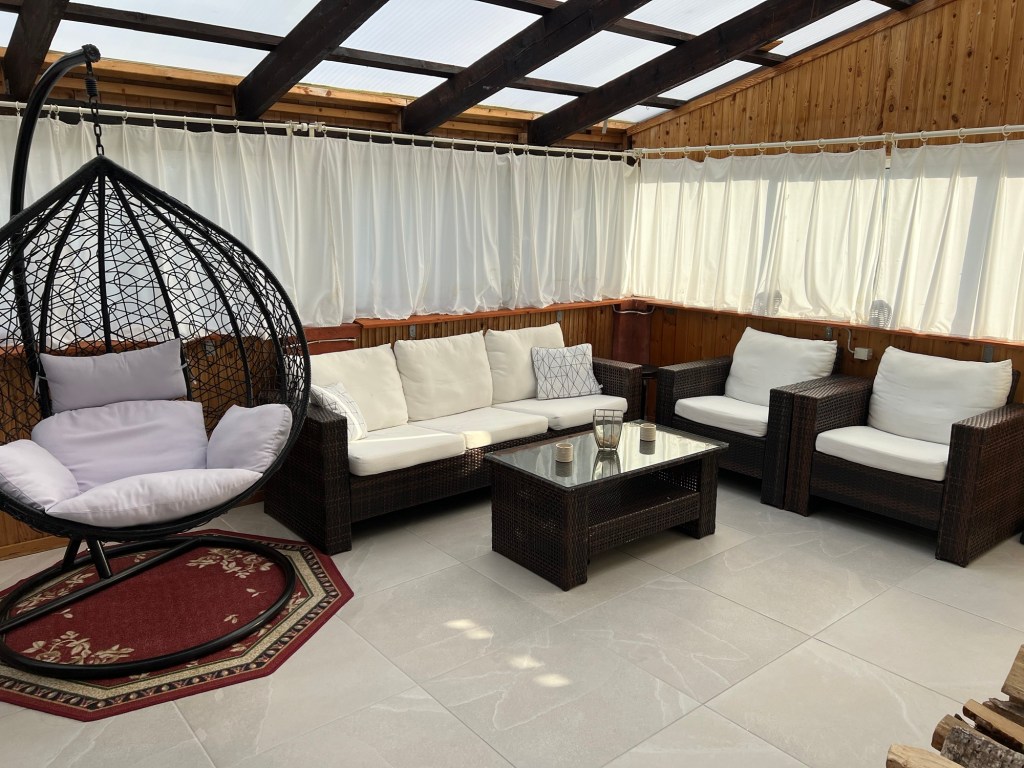 Unsere jetzige Unterkunft ist ein freistehendes Haus mit Wintergarten und Garten.