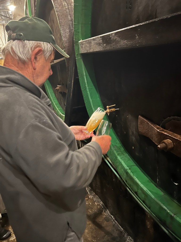 Tägliche werden 3 Mio 0,5 l Flaschen abgefüllt. Wir durften den Höhepunkt der Tour im Keller bei 5 Grad erleben. Frisch vom Fass gezapftes Pils. Da man in Tschechien erst ab 18 Alkohol trinken darf, durfte Sara nicht kosten.