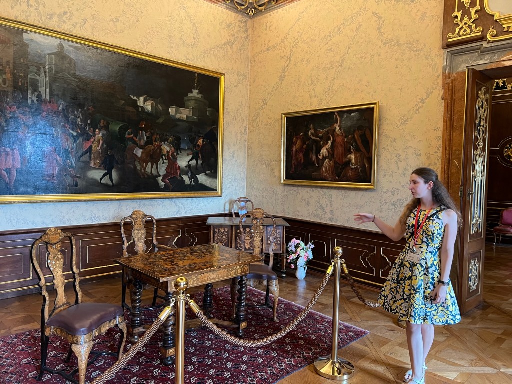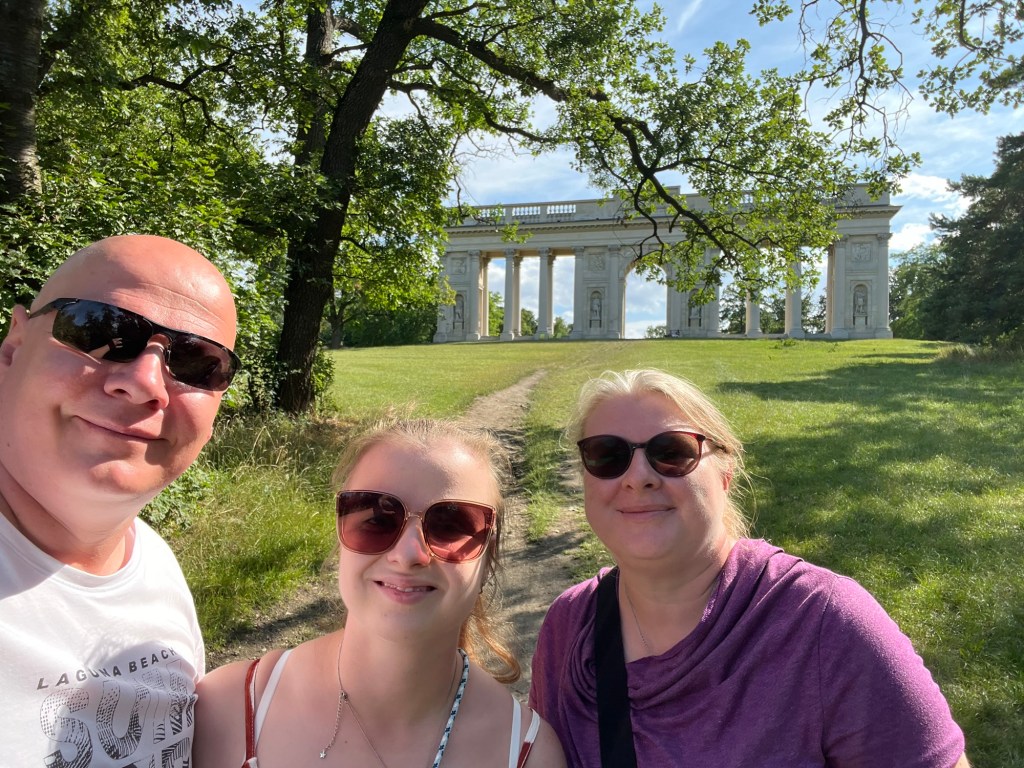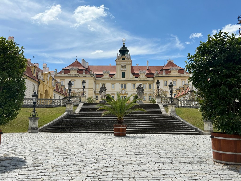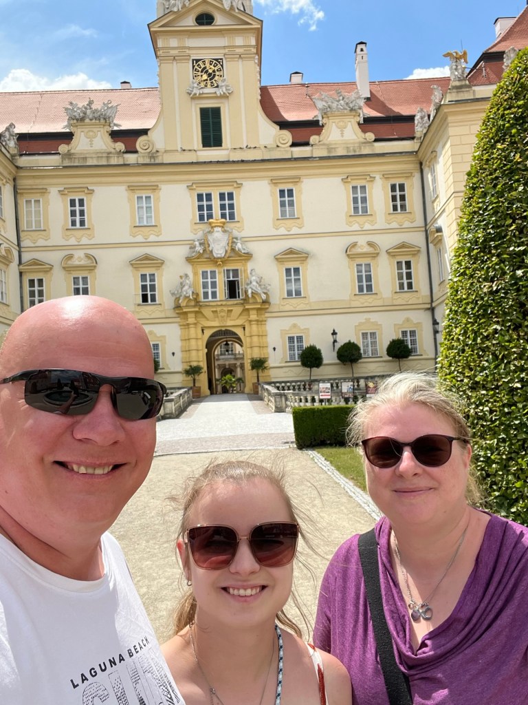 Am Freitag ging es für uns nach Valtice. Ja was soll ich sagen, wir haben uns Schloss Nummer drei angeschaut. Dieses Mal haben wir eine Führung mitgemacht. Die Führung war auf tschechisch und wir hatten ein Heft auf deutsch zu jeden Raum. Bevor es los ging, warteten wir drei allein und dachten schon, oh Gott was soll das geben. Dann kam noch eine Familie aus Tschechien. Die Reiseleiterin war sehr uncool und verstand kein Spaß. Es war eine sehr komische Schlossführung. Riesenlatschen mussten wir anziehen, so spart man sich die Reinigungskräfte. Laufen konnte man da drin nicht wirklich, man ist wie ein Pinguin gewatschelt. Die andere Familie war sehr nett und hat ein paar Fragen von uns auf englisch beantwortet. Das fand die Reiseleiterin nicht schön und fragte gleich, ob es Probleme gibt. Sie war sehr unentspannt. Wenn sie nicht im Raum war, haben wir uns den Spaß gemacht und sind mit den Latschen geschlittert. Wenn die anderen an die Decke geguckt haben, haben wir es einfach auch gemacht. Die Stunde ging vorbei und wir wurden erlöst.