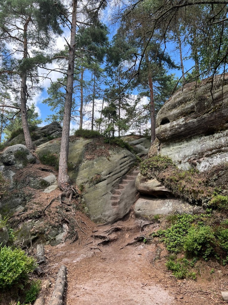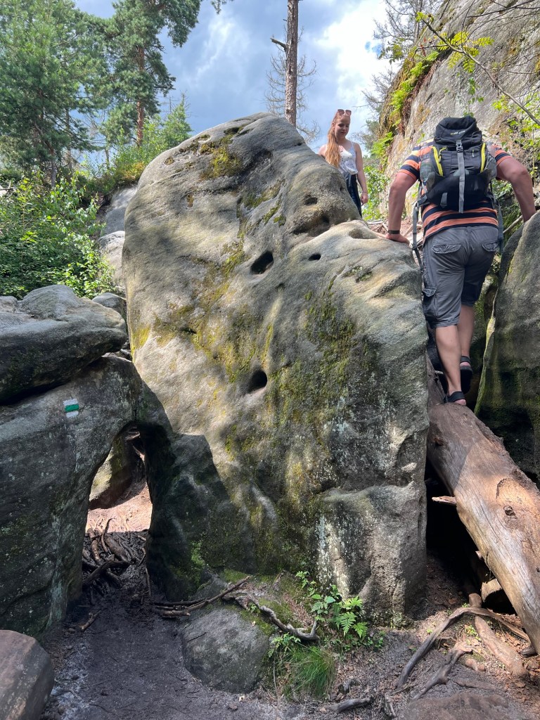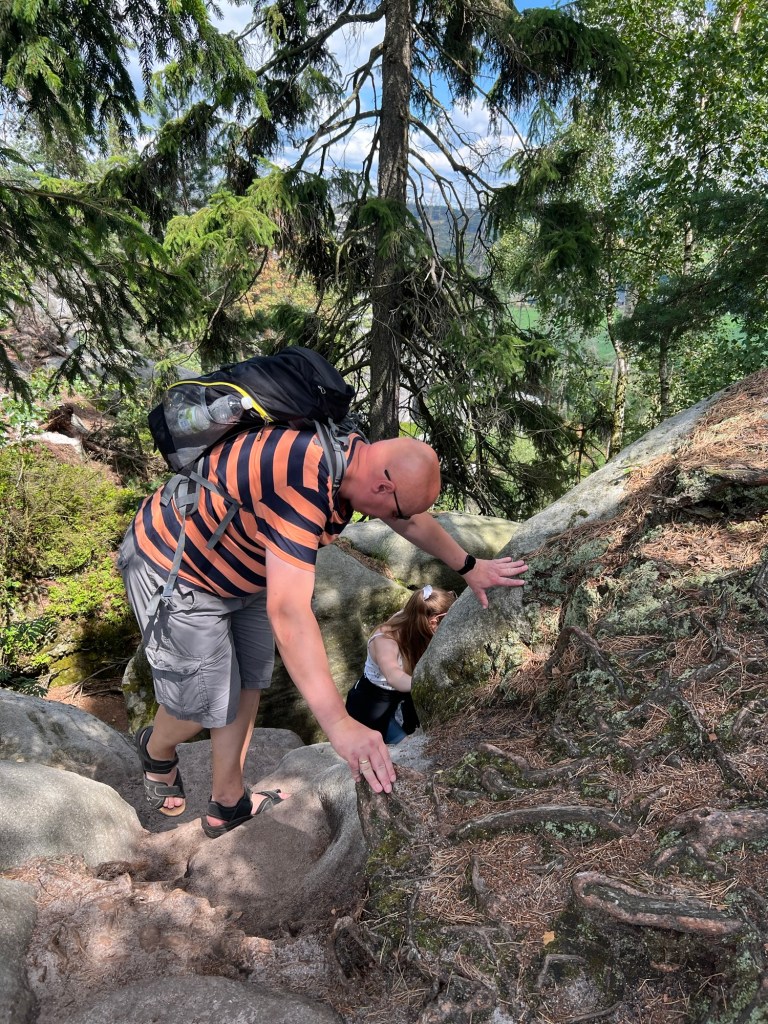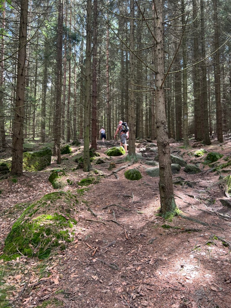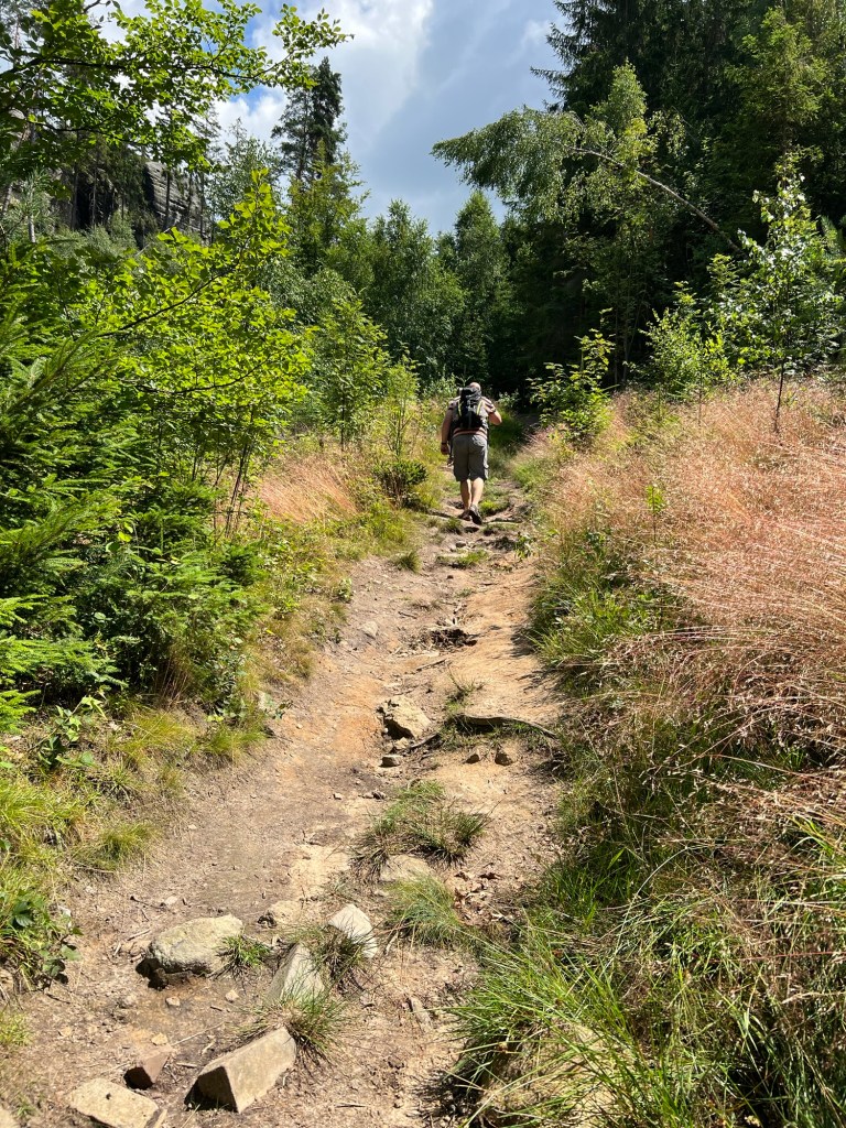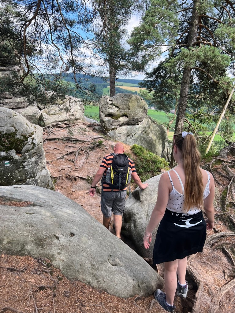 Für Samstag hatten wir bereits am Dienstag Karten für eine touristische Attraktion gekauft. Also fuhren wir gegen 12 Uhr dorthin. Doch wir kamen mit unserem Ticket nicht auf den Parkplatz. Keine Schranke öffnete sich. Ein Mitarbeiter probierte uns zu helfen. Uhrzeit stimmte, aber der Tag nicht. Wir haben für Sonntag gebucht. Also kurzfristige Planänderung und wir haben, das gemacht, was wir für Sonntag geplant hatten. Wir wollten nochmal zu den Katzensteinen, doch dieses Mal vom richtigen Startpunkt über den grünen Wanderweg. Naja so war der Plan. Denn zum Startpunkt haben sie keinen mehr gelassen, der Parkplatz war voll. Also fuhren wir wieder da hin, wo wir Freitag gestartet sind. Nur dieses Mal nahmen wir nicht Sternbergs Abkürzung, sondern den roten Wanderweg. Wir haben nur ein bis zwei Personen getroffen. Das lag daran, dass die roten Wege die anspruchsvollen Wege sind. Am Anfang ging es nur über die Wiese, aber dann nur noch bergauf.