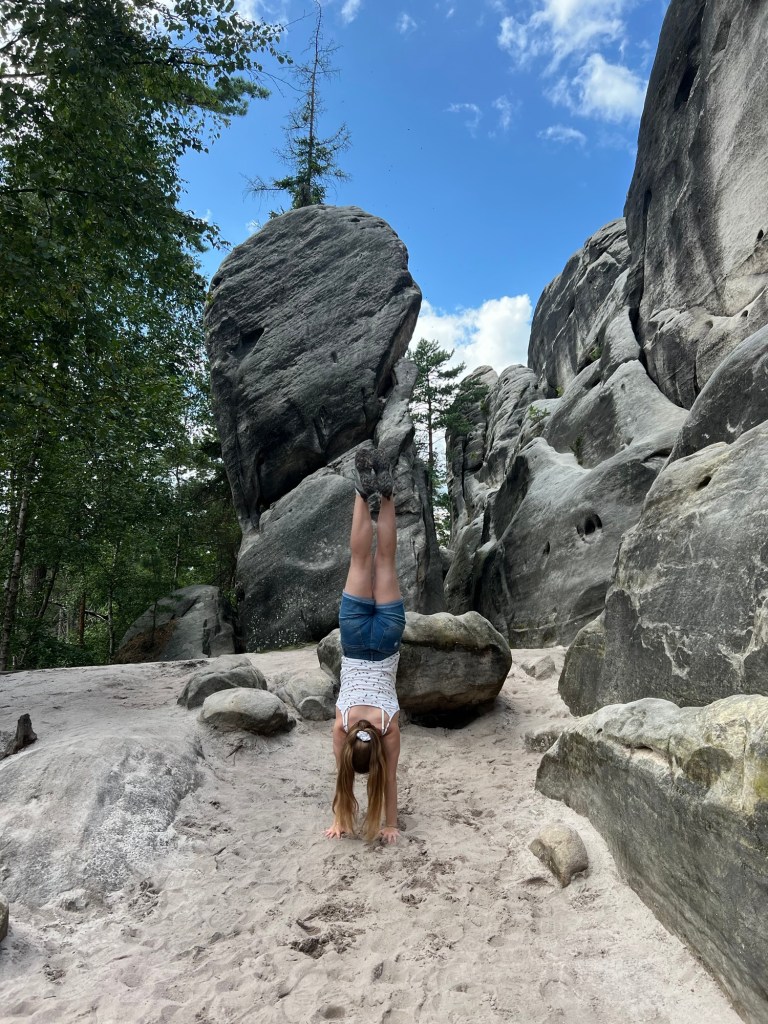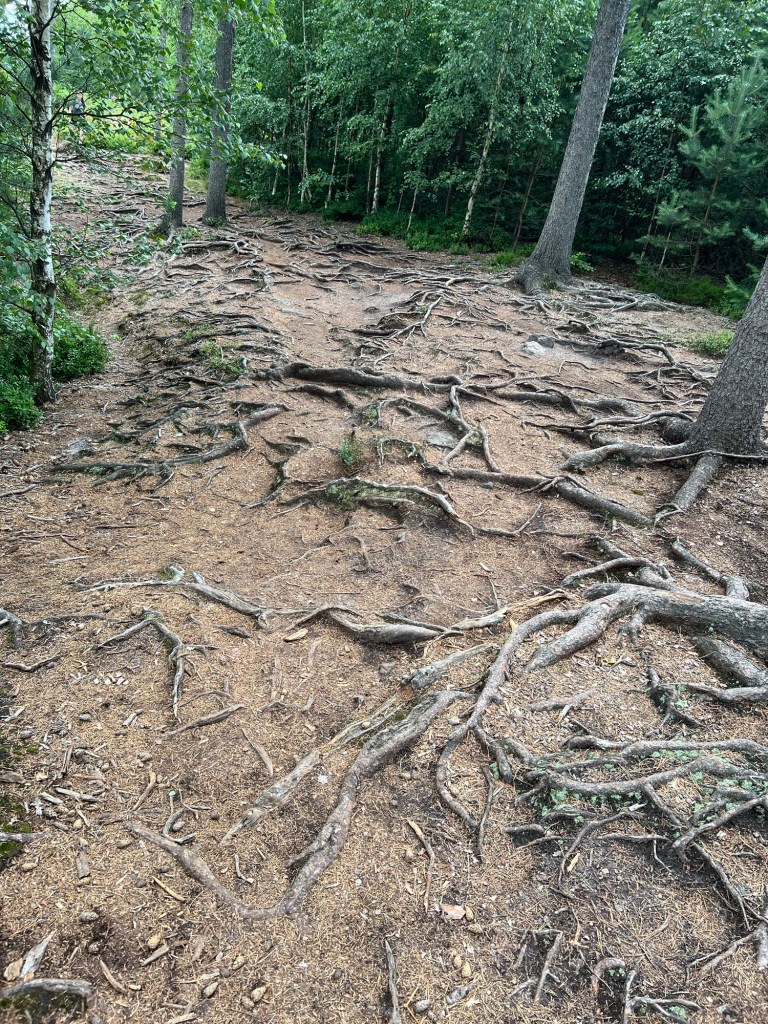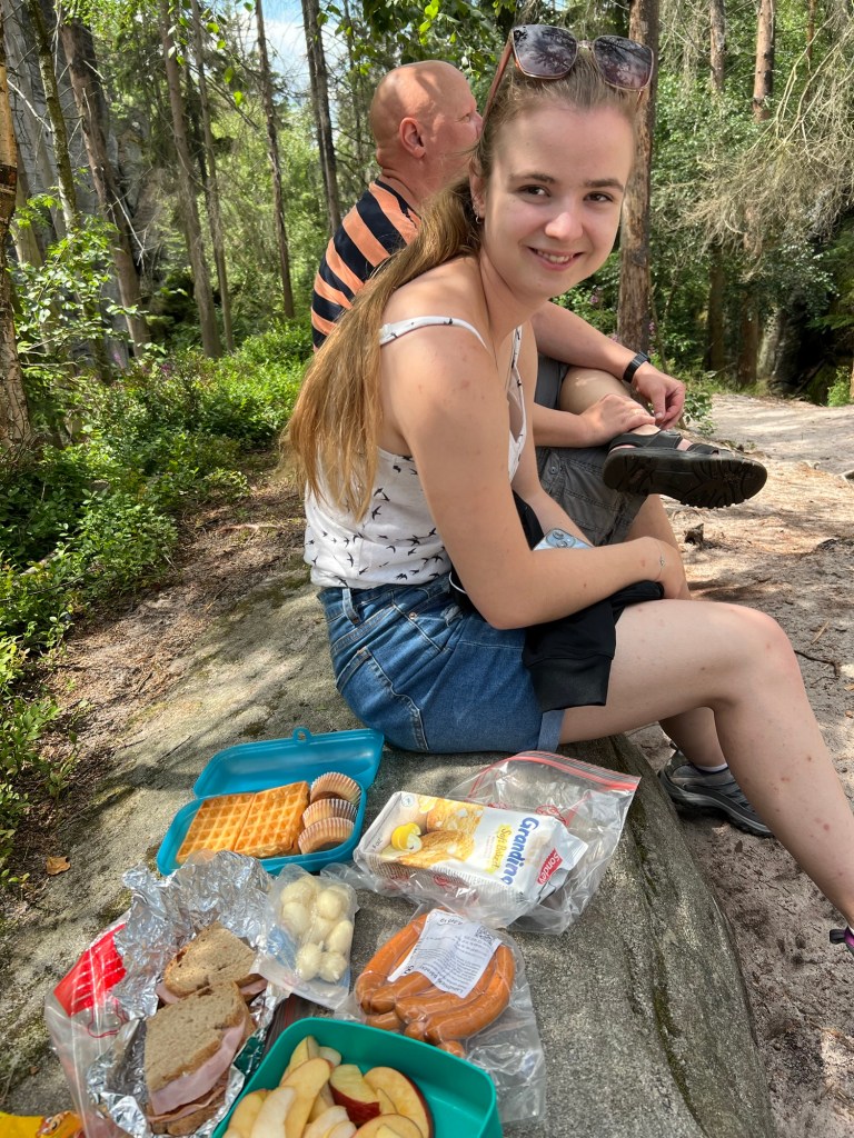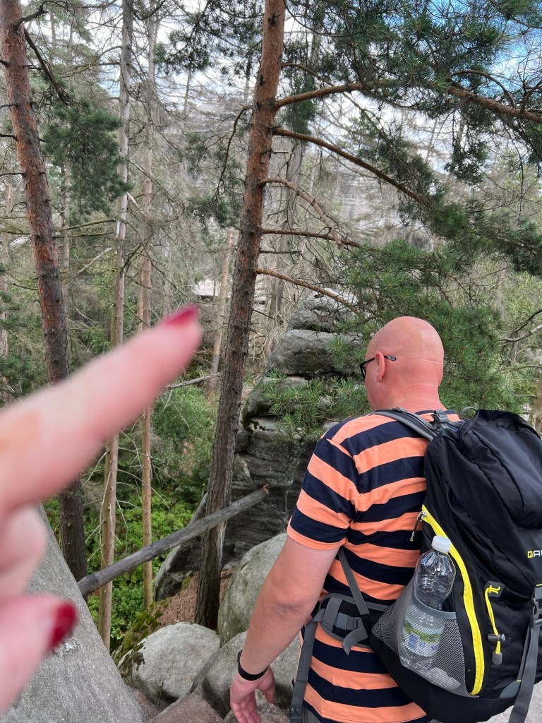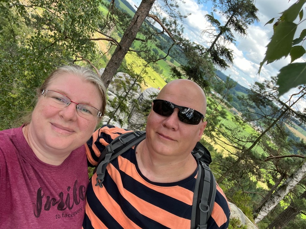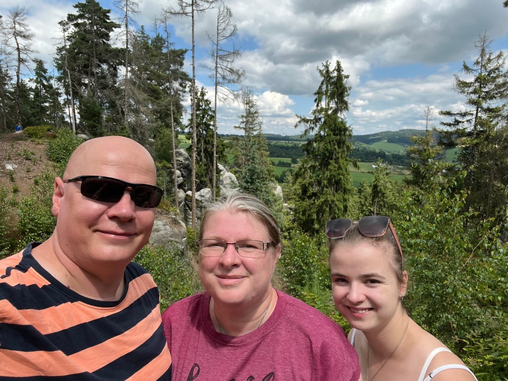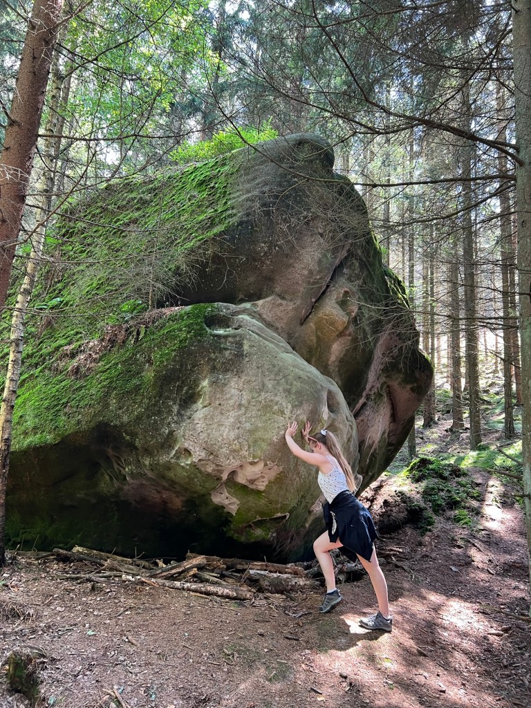 Für Samstag hatten wir bereits am Dienstag Karten für eine touristische Attraktion gekauft. Also fuhren wir gegen 12 Uhr dorthin. Doch wir kamen mit unserem Ticket nicht auf den Parkplatz. Keine Schranke öffnete sich. Ein Mitarbeiter probierte uns zu helfen. Uhrzeit stimmte, aber der Tag nicht. Wir haben für Sonntag gebucht. Also kurzfristige Planänderung und wir haben, das gemacht, was wir für Sonntag geplant hatten. Wir wollten nochmal zu den Katzensteinen, doch dieses Mal vom richtigen Startpunkt über den grünen Wanderweg. Naja so war der Plan. Denn zum Startpunkt haben sie keinen mehr gelassen, der Parkplatz war voll. Also fuhren wir wieder da hin, wo wir Freitag gestartet sind. Nur dieses Mal nahmen wir nicht Sternbergs Abkürzung, sondern den roten Wanderweg. Wir haben nur ein bis zwei Personen getroffen. Das lag daran, dass die roten Wege die anspruchsvollen Wege sind. Am Anfang ging es nur über die Wiese, aber dann nur noch bergauf.