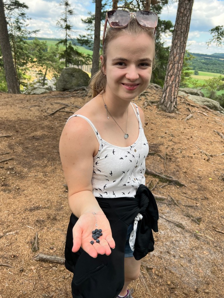 Als wir oben angekommen sind, haben wir den grünen Wanderweg gekreuzt und ganz viele Touristen getroffen. Jetzt war es einfacher zu laufen. Und leckere Heidelbeeren konnten wir frisch vom Strauch auch essen.